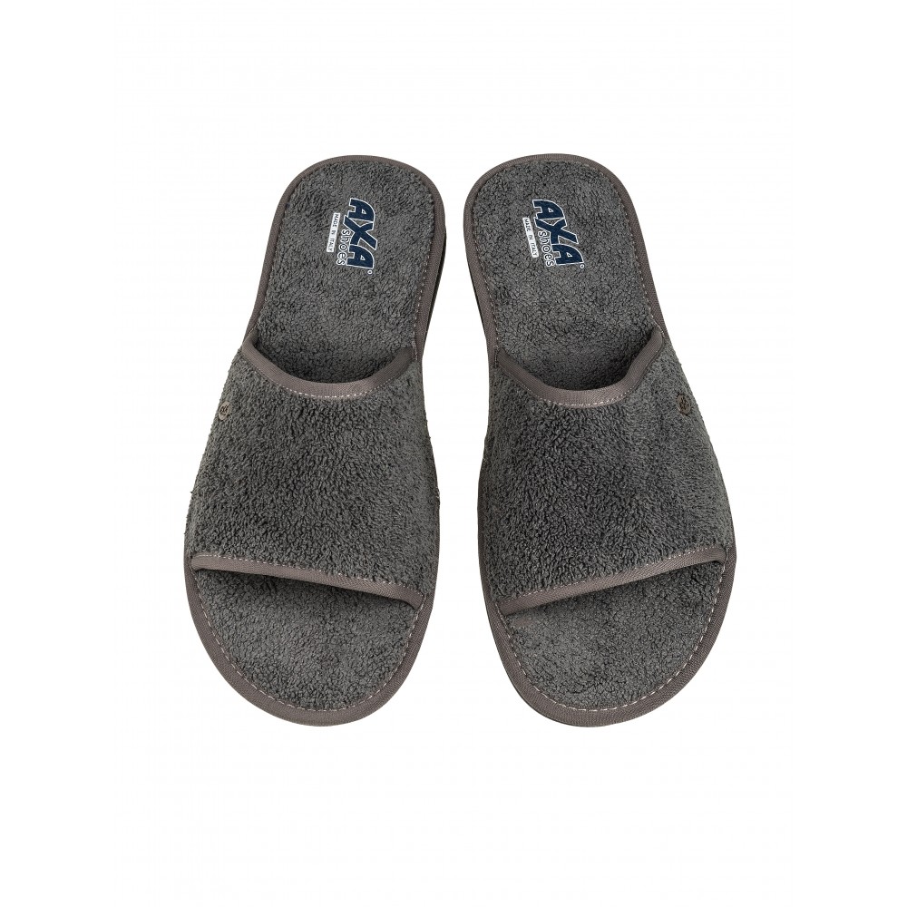 Махровые открытые тапочки AXA (АКСА) от итальянского производителя компании AXA Shoes в сером цвете. Тапочки AXA - это уютная обувь для дома с анатомическими свойствами. Мужские домашние тапочки выполнены из натурального хлопка с добавлением бамбуковых нитей. Подошва выполнена из ПВХ с применением вспененного латекса, благодаря чему подошва легкая и не скользит на любом полу. Стельки из хлопка впитывают излишки влаги с ваших стоп. Благодаря технологии Deo-Fit они имеют нежный цветочный аромат, который сохраняется в течение 6 месяцев. Технология Deo-Push позволяет продлить этот аромат. Для этого вы можете в отверстие в боковой части подошвы впрыснуть ваш любимый парфюм.