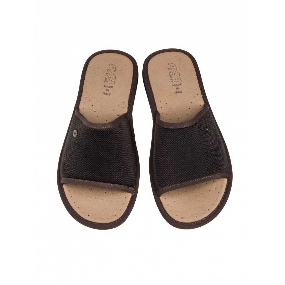 Мужские открытые тапочки AXA shoes — это комфортная обувь для дома, в которой применены уникальные запатентованные технологии. Верх выполнен из хлопка  высокого качества. Модель представлена в коричневомом цвете. Стельки выполнены из латекса с использованием угольной пыли, которая абсорбирует часть влажности ступни. Данный процесс имеет антибактериальный эффект. Специальная подошва из полиуретана с технологий Анти-шок уменьшает нагрузку на позвоночник и суставы. Благодаря технологии DEO-FIT тапочкам можно придать приятный запах, который сохраняется в течение 6 месяцев. Технология DEO-PUSH позволяет продлить этот аромат. Для этого в отверстие с внутренней стороны подошвы можно дозаправить ваш любимый парфюм. Домашняя обувь позволяет снизить усталость в ногах, является прекрасным расслабляющим средством для всех тех, кто в течение дня проводит много времени на ногах.