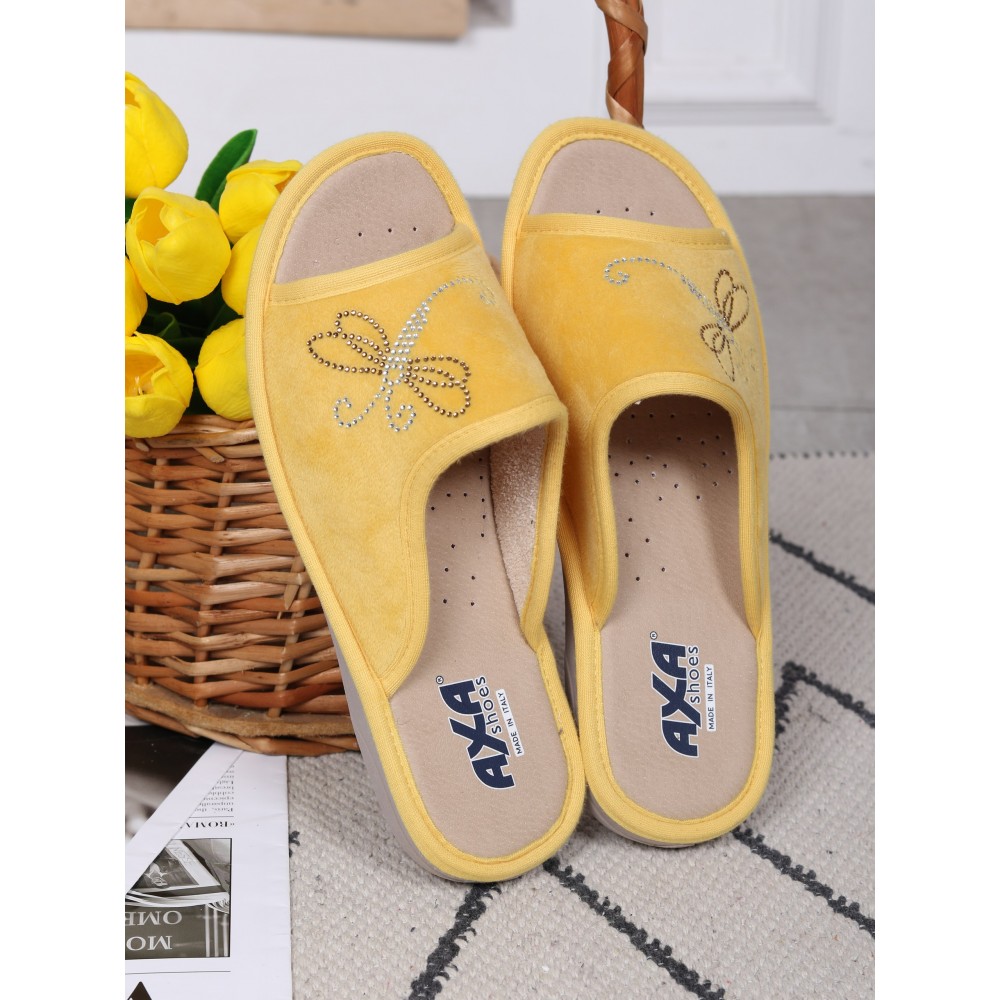 Итальянский производитель AXA Shoes Italia представляет комфортные домашние женские тапочки в желтом цвете. Женские тапочки AXA Shoes — это комфортная обувь для дома, в которой применены уникальные запатентованные технологии. Материал верха – велюр, выполнен из натурального качественного хлопка, украшенного стразами. Дизайн придаёт модели особый шарм и навеян домашним уютом. Модель представлена в нескольких цветах. Стельки выполнены из экокожи с использованием угольной пыли, которая абсорбирует часть влажности ступни. Данный процесс имеет антибактериальный эффект. Гибкая подошва из ПВХ имеет подложку из вспененного латекса, который при ходьбе принимает форму вашей стопы. Подошва с технологий «Анти-шок» уменьшает нагрузку на позвоночник и суставы. Благодаря технологии DEO-FIT тапочки имеют нежный цветочный аромат, который сохраняется в течение 6 месяцев. Технология DEO-PUSH позволяет продлить этот аромат. Для этого в отверстие подошвы можно впрыснуть ваш любимый парфюм. Домашняя обувь позволяет снизить усталость в ногах, является прекрасным расслабляющим средством для всех тех, кто в течение дня проводит много времени на ногах. Отличный подарок на любой праздник. Носите удобную и качественную обувь AXA с удовольствием!  Обратите внимание, что тапочки AXA произведены в Италии с европейскими размерами, поэтому рекомендуется заказывать комнатные тапочки на размер больше.