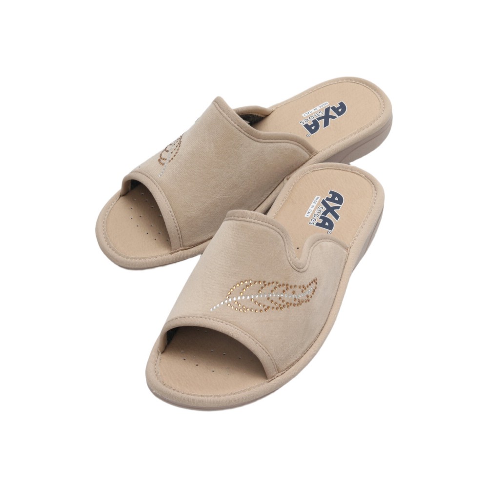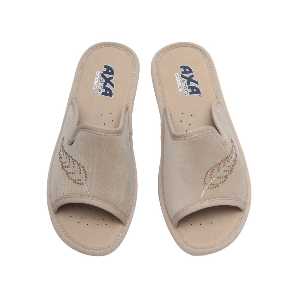 Итальянский производитель AXA Shoes Italia представляет комфортные домашние женские тапочки в бежевом цвете. Женские тапочки AXA  — это комфортная обувь для дома, в которой применены уникальные запатентованные технологии. Материал верха – велюр, выполнен из натурального качественного хлопка, украшенного стразами. Дизайн придаёт модели особый шарм и навеян домашним уютом. Модель представлена в нескольких цветах. Стельки выполнены из экокожи с использованием угольной пыли, которая абсорбирует часть влажности ступни. Данный процесс имеет антибактериальный эффект. Гибкая подошва из ПВХ имеет подложку из вспененного латекса, который при ходьбе принимает форму вашей стопы. Подошва с технологий «Анти-шок» уменьшает нагрузку на позвоночник и суставы. Благодаря технологии DEO-FIT тапочки имеют нежный цветочный аромат, который сохраняется в течение 6 месяцев. Технология DEO-PUSH позволяет продлить этот аромат. Для этого в отверстие подошвы можно впрыснуть ваш любимый парфюм. Домашняя обувь позволяет снизить усталость в ногах, является прекрасным расслабляющим средством для всех тех, кто в течение дня проводит много времени на ногах. Отличный подарок на любой праздник. Носите удобную и качественную обувь AXA с удовольствием!  Обратите внимание, что тапочки AXA произведены в Италии с европейскими размерами, поэтому рекомендуется заказывать комнатные тапочки на размер больше.