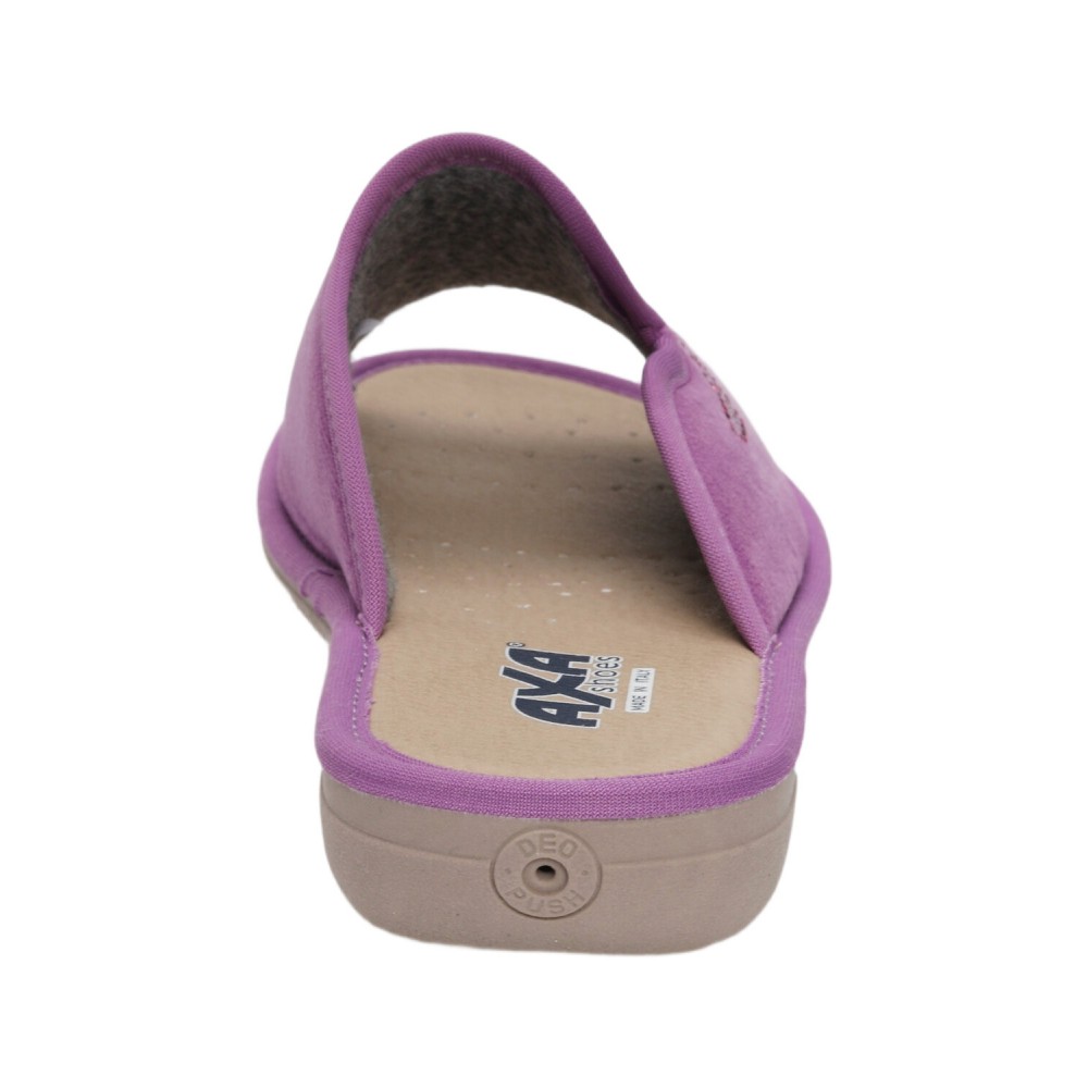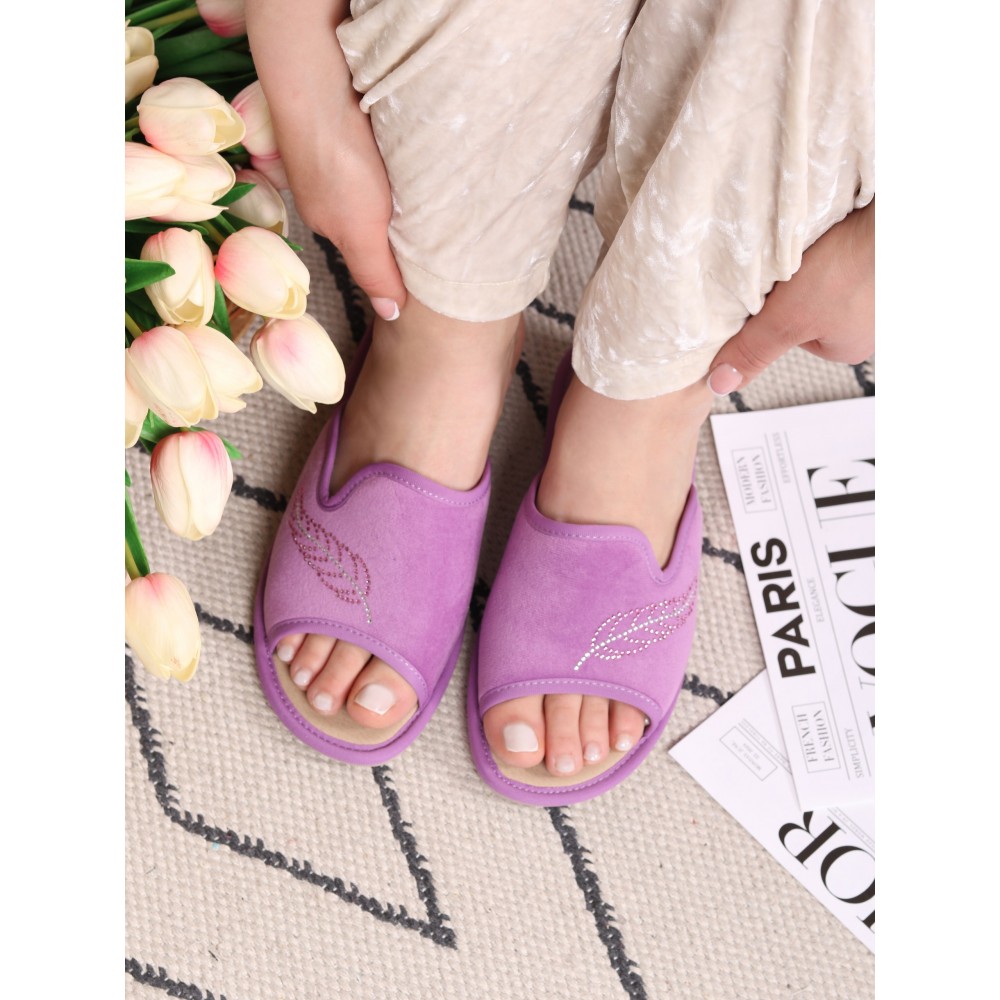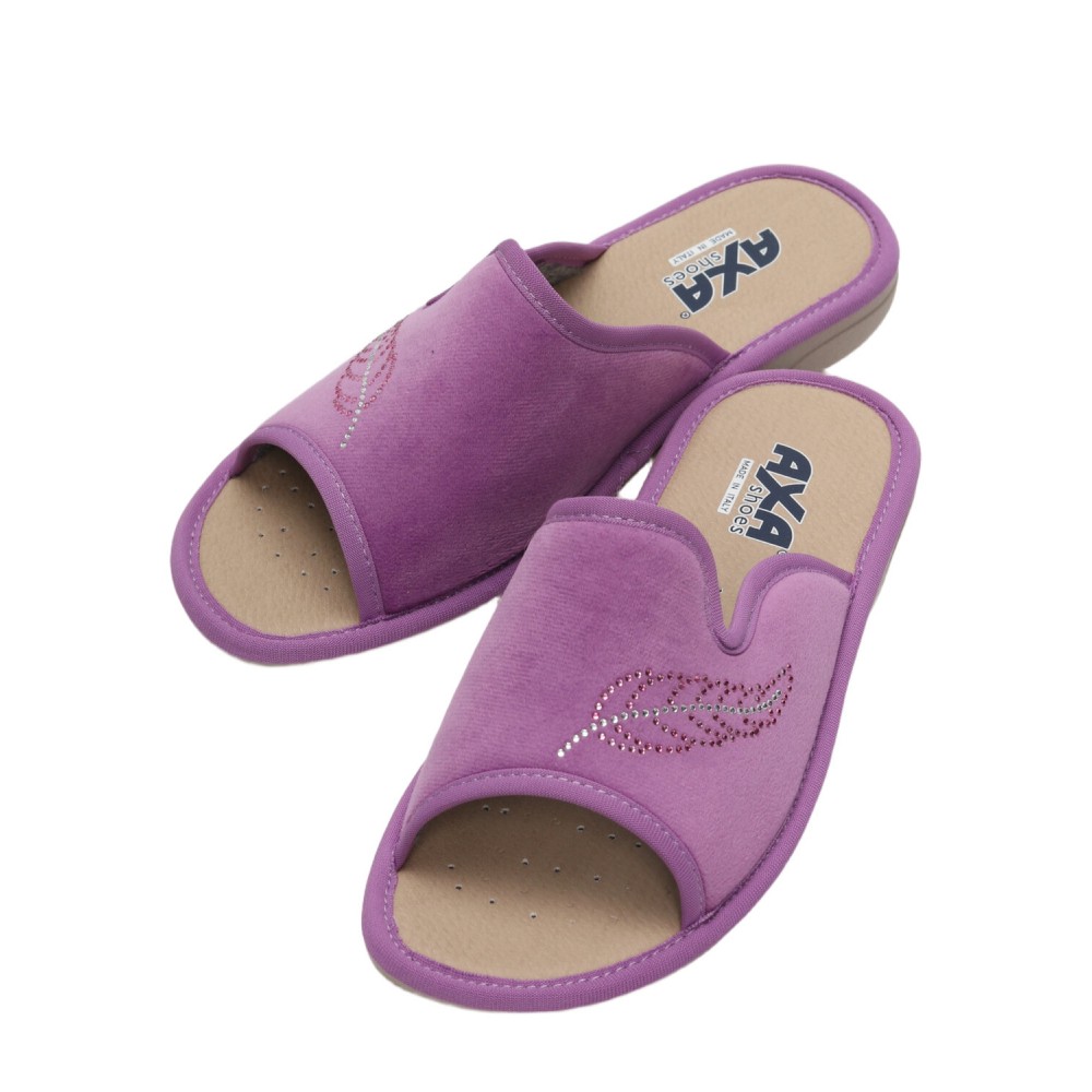 Итальянский производитель AXA Shoes Italia представляет комфортные домашние женские тапочки в лиловом цвете. Женские тапочки AXA Shoes — это комфортная обувь для дома, в которой применены уникальные запатентованные технологии. Материал верха – велюр, выполнен из натурального качественного хлопка, украшенного стразами. Дизайн придаёт модели особый шарм и навеян домашним уютом. Модель представлена в нескольких цветах. Стельки выполнены из экокожи с использованием угольной пыли, которая абсорбирует часть влажности ступни. Данный процесс имеет антибактериальный эффект. Гибкая подошва из ПВХ имеет подложку из вспененного латекса, который при ходьбе принимает форму вашей стопы. Подошва с технологий «Анти-шок» уменьшает нагрузку на позвоночник и суставы. Благодаря технологии DEO-FIT тапочки имеют нежный цветочный аромат, который сохраняется в течение 6 месяцев. Технология DEO-PUSH позволяет продлить этот аромат. Для этого в отверстие подошвы можно впрыснуть ваш любимый парфюм. Домашняя обувь позволяет снизить усталость в ногах, является прекрасным расслабляющим средством для всех тех, кто в течение дня проводит много времени на ногах. Отличный подарок на любой праздник. Носите удобную и качественную обувь AXA с удовольствием! Обратите внимание, что тапочки AXA произведены в Италии с европейскими размерами, поэтому рекомендуется заказывать комнатные тапочки на размер больше.