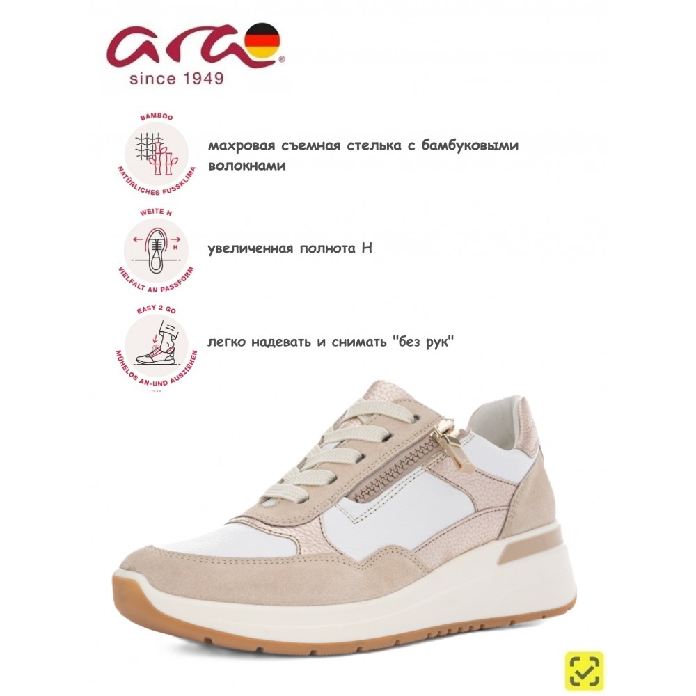 Женские кроссовки на танкетке в колодке GARDA от немецкого производителя анатомической обуви ARA выполнены из мягкой натуральной кожи, простой в уходе. Модель имеет полноту H - колодка для более широкой стопы. Махровая подкладка и съемная стелька из текстиля с добавлением бамбуковых волокон позволяет сохранять комфортный микроклимат. Устойчивая нескользящая подошва и мягкая амортизирующая стелька не дадут вашим ножкам устать в течение дня. Кроссовки женские ARA имеют ряд уникальных инноваций, запатентованных компанией - технология High Soft - это сочетание сверхмягкой кожи, гибкой подошвы и невероятно приятной по ощущениям стельки. Шнуровка и молния на поверхности делают ношение этих кроссовок еще более удобным и функциональным. Кожаные легкие кроссовки ARA с молнией очень красивые и подходят на каждый день, для прогулок, для путешествий, для вечеринок и развлекательных мероприятий. Бежевые кроссовки можно надевать под джинсы, под спортивный костюм, под платье, под юбку. Носите удобную и качественную обувь с удовольствием.