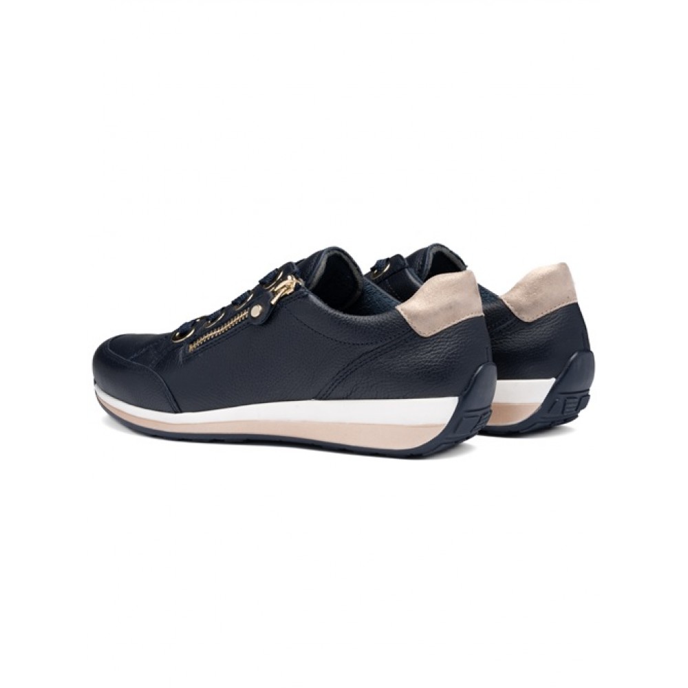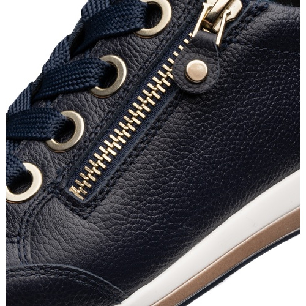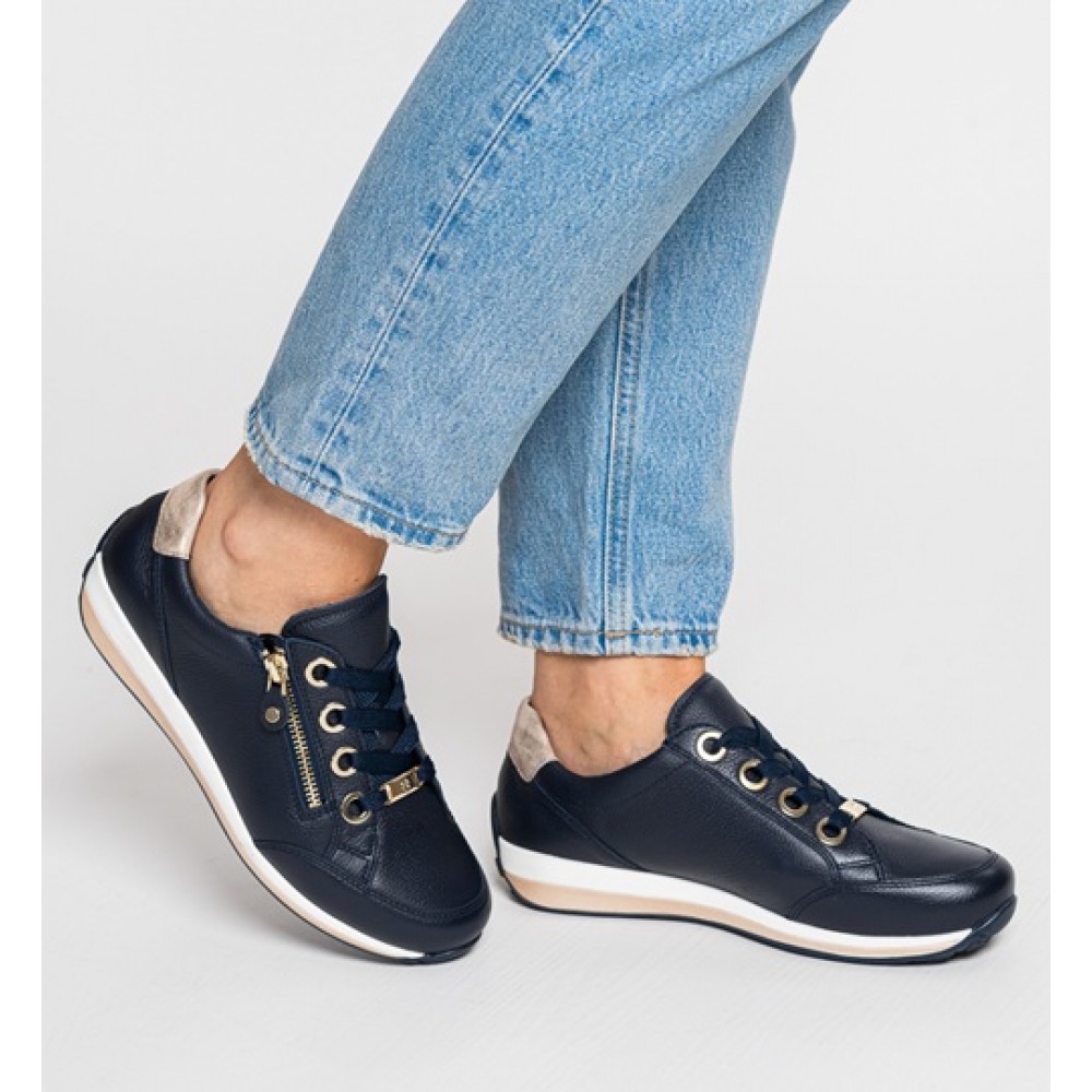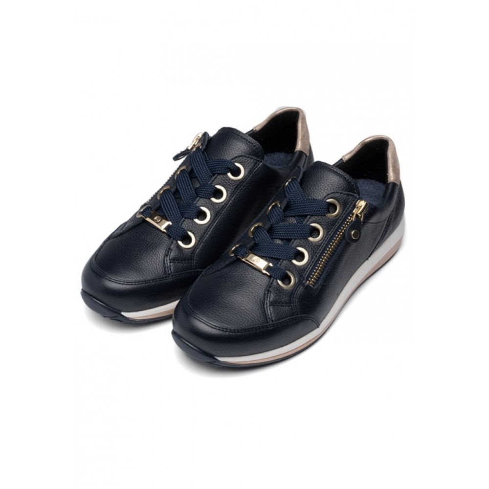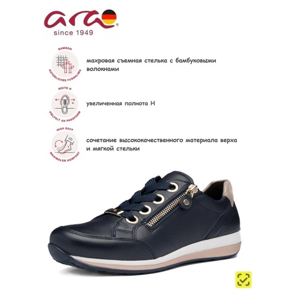 Женские кроссовки в популярной колодке OSAKA от немецкого производителя анатомической обуви ARA выполнены из мягкой натуральной кожи, простой в уходе. Модель имеет полноту H - колодка для более широкой стопы. Махровая подкладка и съемная стелька из текстиля с добавлением бамбуковых волокон позволяет сохранять комфортный микроклимат. Устойчивая нескользящая подошва и мягкая амортизирующая стелька не дадут вашим ножкам устать в течение дня. Кроссовки женские ARA имеют ряд уникальных инноваций, запатентованных компанией - технология High Soft - это сочетание сверхмягкой кожи, гибкой подошвы и невероятно приятной по ощущениям стельки. Шнуровка и молния на поверхности делают ношение этих кроссовок еще более удобным и функциональным. Кожаные легкие кроссовки ARA с молнией очень красивые и подходят на каждый день, для прогулок, для путешествий, для вечеринок и развлекательных мероприятий. Темно-синие кроссовки можно надевать под джинсы, под спортивный костюм, под платье, под юбку. Носите удобную и качественную обувь с удовольствием.