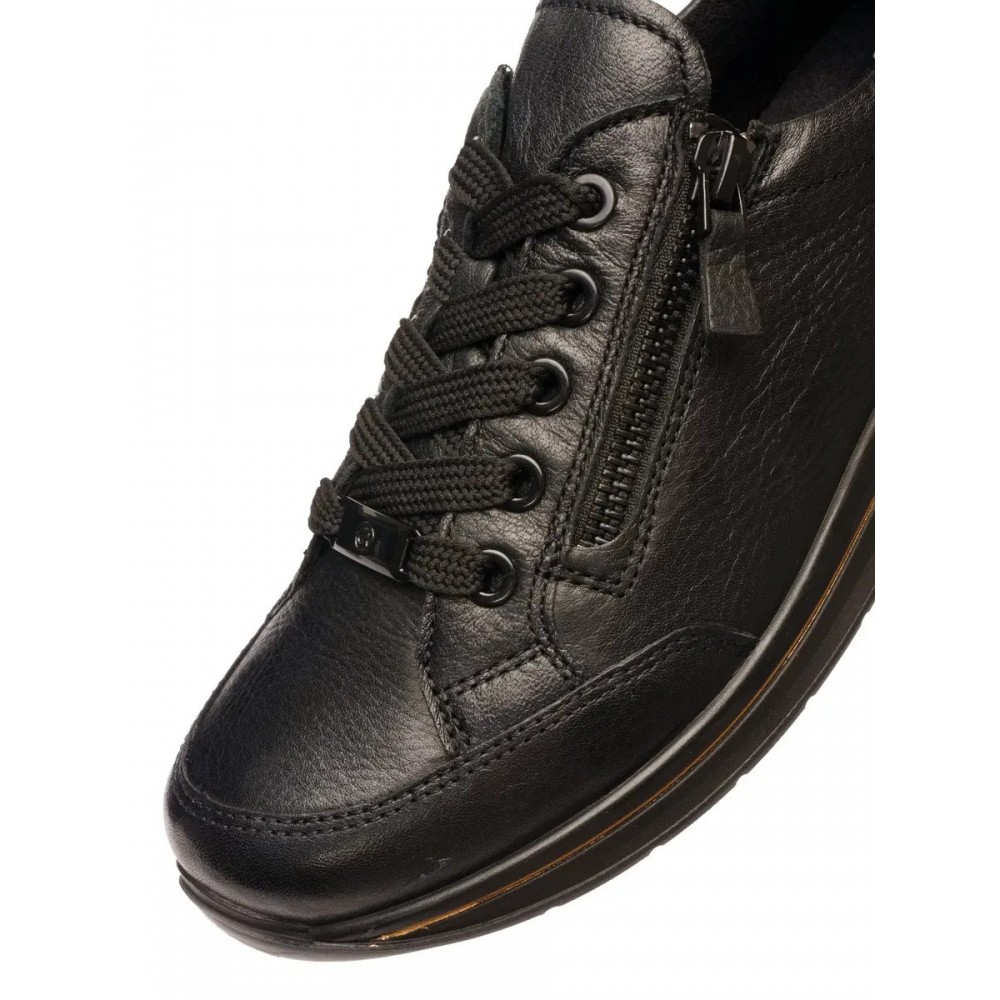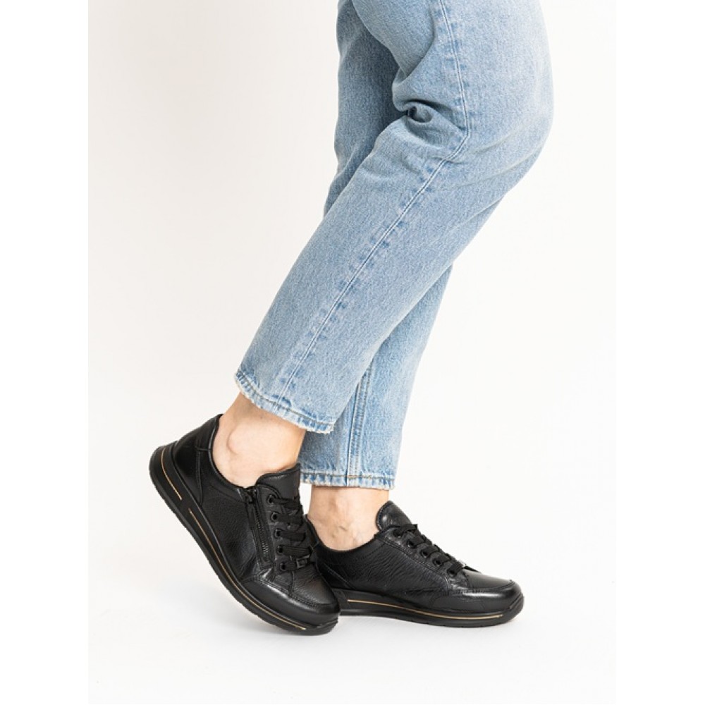 Женские кроссовки в популярной колодке OSAKA от немецкого производителя анатомической обуви ARA выполнены из мягкой натуральной кожи, простой в уходе. Модель имеет полноту H - колодка для более широкой стопы. Махровая подкладка и съемная стелька из текстиля с добавлением бамбуковых волокон позволяет сохранять комфортный микроклимат. Устойчивая нескользящая подошва и мягкая амортизирующая стелька не дадут вашим ножкам устать в течение дня. Кроссовки женские ARA имеют ряд уникальных инноваций, запатентованных компанией - технология High Soft - это сочетание сверхмягкой кожи, гибкой подошвы и невероятно приятной по ощущениям стельки. Шнуровка и молния на поверхности делают ношение этих кроссовок еще более удобным и функциональным. Кожаные легкие кроссовки ARA с молнией очень красивые и подходят на каждый день, для прогулок, для путешествий, для вечеринок и развлекательных мероприятий. Кроссовки в черном цвете можно надевать под джинсы, под спортивный костюм, под платье, под юбку. Носите удобную и качественную обувь с удовольствием.