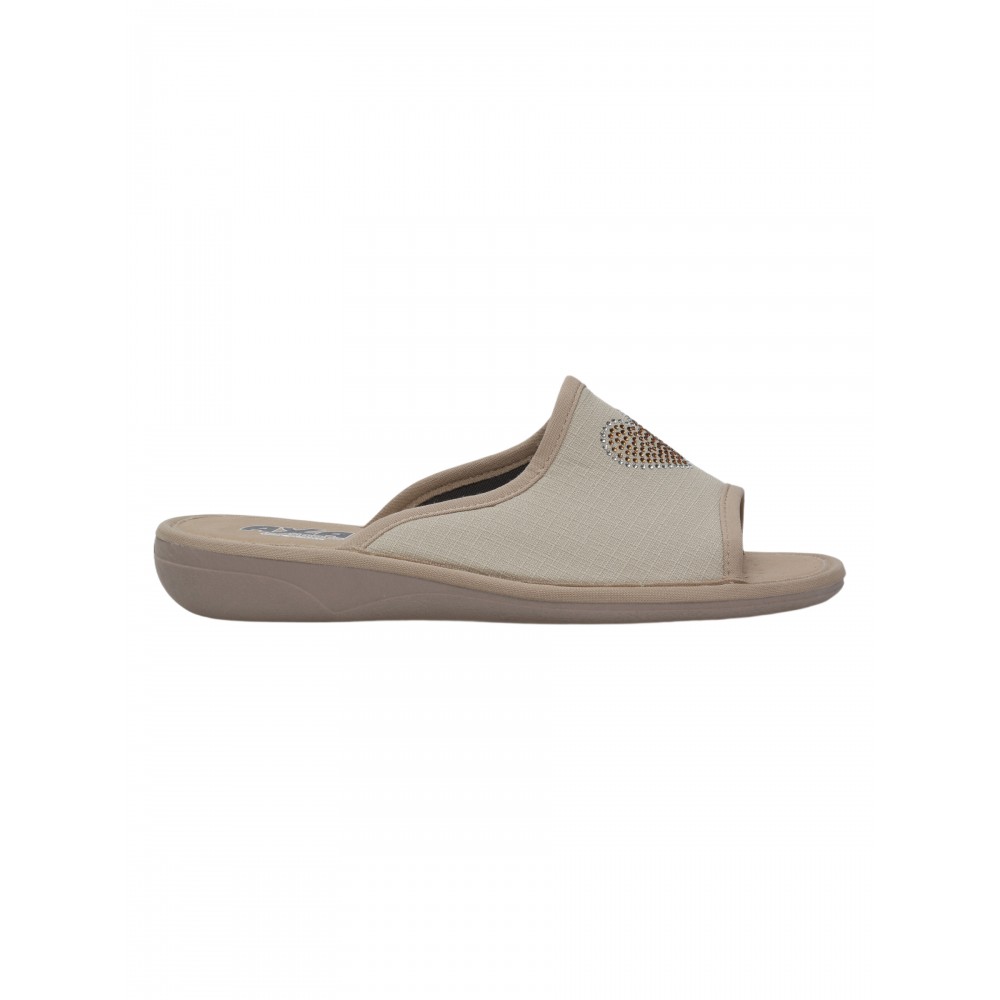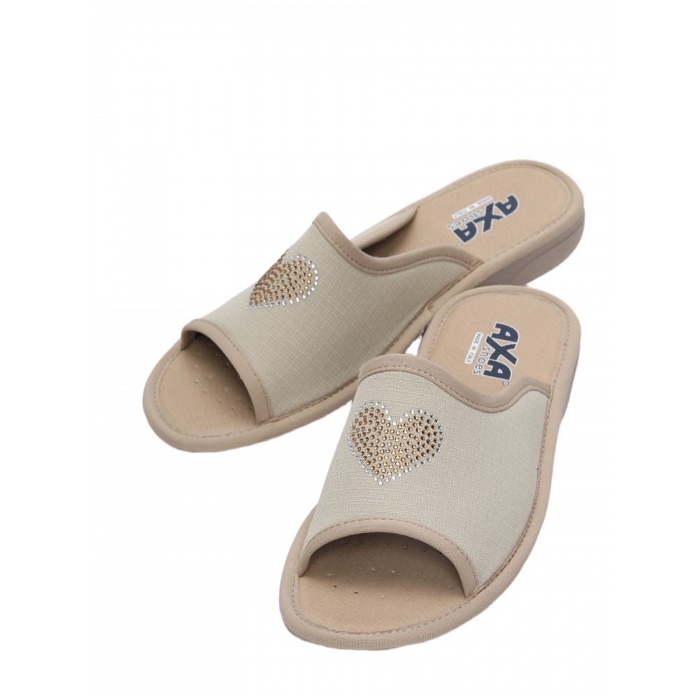 Итальянский производитель AXA Shoes Italia представляет комфортные комнатные тапочки летней коллекции.Нежный светло - бежевый цвет верхней части этой модели с рисунком из сверкающих страз в виде сердечка смотрится безупречно. Тапочки благоухают нежным цветочным ароматом. В пяточной части подошвы находится маленькое отверстие для повторной ароматизации тапочек Вашими любимыми запахами. Это технология называется Deo Push. Женские тапочки AXA — это комфортная обувь для дома. Гибкая подошва из ПВХ имеет подложку из вспененного латекса, который при ходьбе принимает форму вашей стопы. Стельки из экокожи с угольным напылением впитывают излишки влаги стопы. Благодаря технологии DEO-FIT тапочки имеют нежный цветочный аромат, который сохраняется в течение 6 месяцев.  Итак, тапочки AXA shoes – лёгкие, мягкие и красивые – идеальный вариант для Вашей привлекательности и комфорта дома! Обратите внимание, что тапочки AXA произведены в Италии с европейскими размерами, поэтому рекомендуется заказывать комнатные тапочки на размер больше.