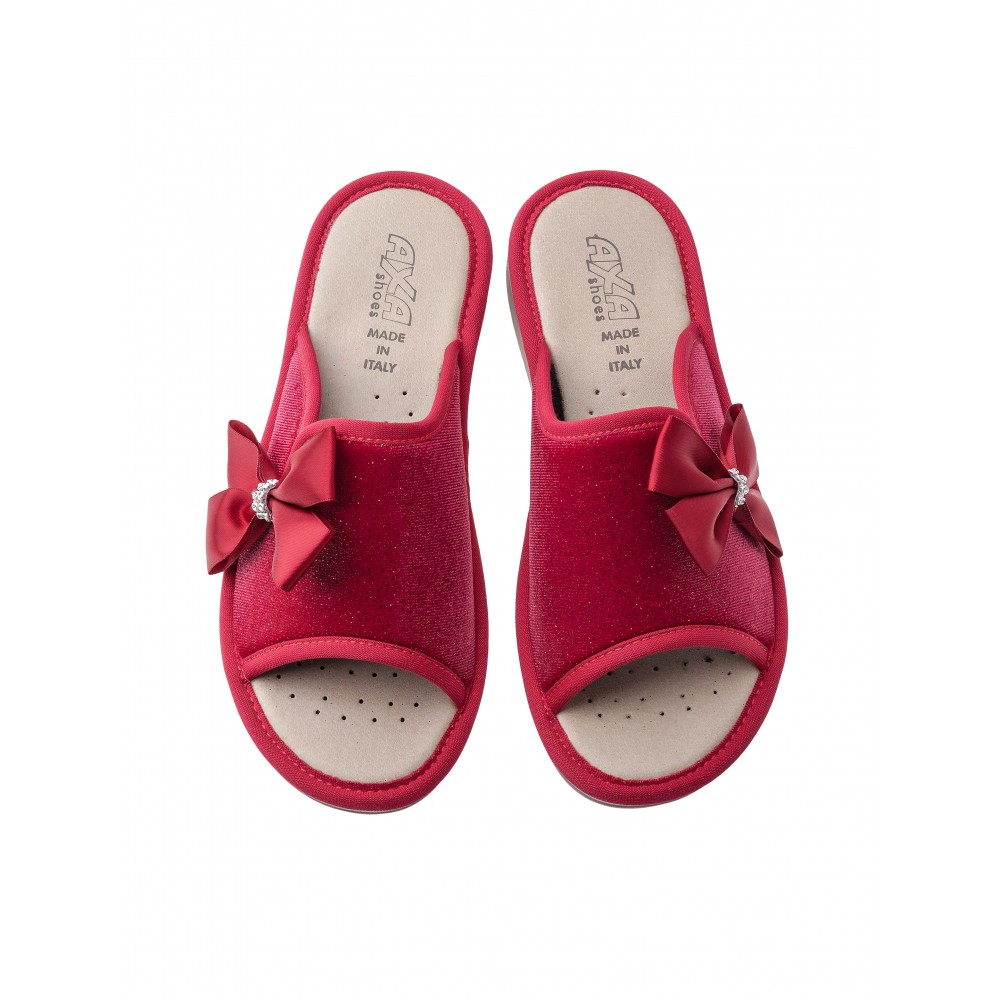Блеск в коллекции домашней обуви AXA от итальянского производителя Аха Shoes. Верхняя часть выполнена из мягкого с легким блеском велюра. А атласный бантик c брошью - настоящее ювелирное украшение. Тапочки имеют антискользящую подошву из вспененного латекса, которая при ходьбе снимает нагрузку на пяточную часть стопы. Благодаря технологии Deo Fit домашняя обувь Аха (АКСА) имеет приятный цветочный аромат. Технология Deo Push позволяет продлить этот аромат. Для этого вы можете в отверстие во внутренней части подошвы впрыснуть ваш любимый парфюм. Тапочки АХА необходимы для каждой современной женщины. Носите удобную и качественную обувь AXA с удовольствием! Обратите внимание, что тапочки AXA произведены в Италии с европейскими размерами, поэтому рекомендуется заказывать комнатные тапочки на размер больше.