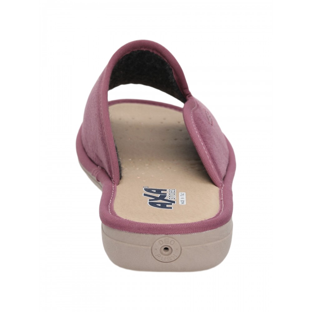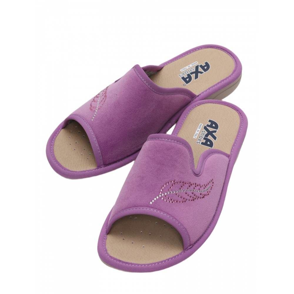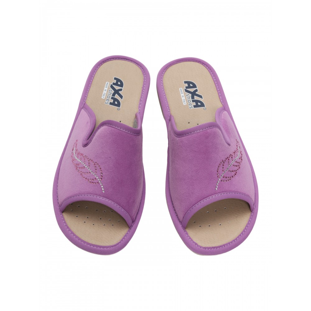 Итальянский производитель AXA Shoes Italia представляет комфортные домашние женские тапочки в лиловом цвете. Женские тапочки AXA Shoes — это комфортная обувь для дома, в которой применены уникальные запатентованные технологии. Материал верха – велюр, выполнен из натурального качественного хлопка, украшенного стразами. Дизайн придаёт модели особый шарм и навеян домашним уютом. Модель представлена в нескольких цветах. Стельки выполнены из экокожи с использованием угольной пыли, которая абсорбирует часть влажности ступни. Данный процесс имеет антибактериальный эффект. Гибкая подошва из ПВХ имеет подложку из вспененного латекса, который при ходьбе принимает форму вашей стопы. Подошва с технологий «Анти-шок» уменьшает нагрузку на позвоночник и суставы. Благодаря технологии DEO-FIT тапочки имеют нежный цветочный аромат, который сохраняется в течение 6 месяцев. Технология DEO-PUSH позволяет продлить этот аромат. Для этого в отверстие подошвы можно впрыснуть ваш любимый парфюм. Домашняя обувь позволяет снизить усталость в ногах, является прекрасным расслабляющим средством для всех тех, кто в течение дня проводит много времени на ногах. Отличный подарок на любой праздник. Носите удобную и качественную обувь AXA с удовольствием! Обратите внимание, что тапочки AXA произведены в Италии с европейскими размерами, поэтому рекомендуется заказывать комнатные тапочки на размер больше.