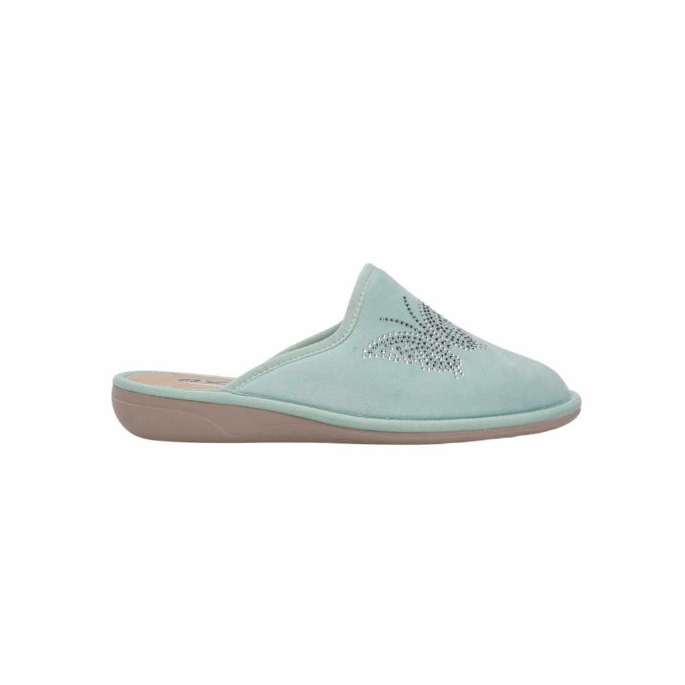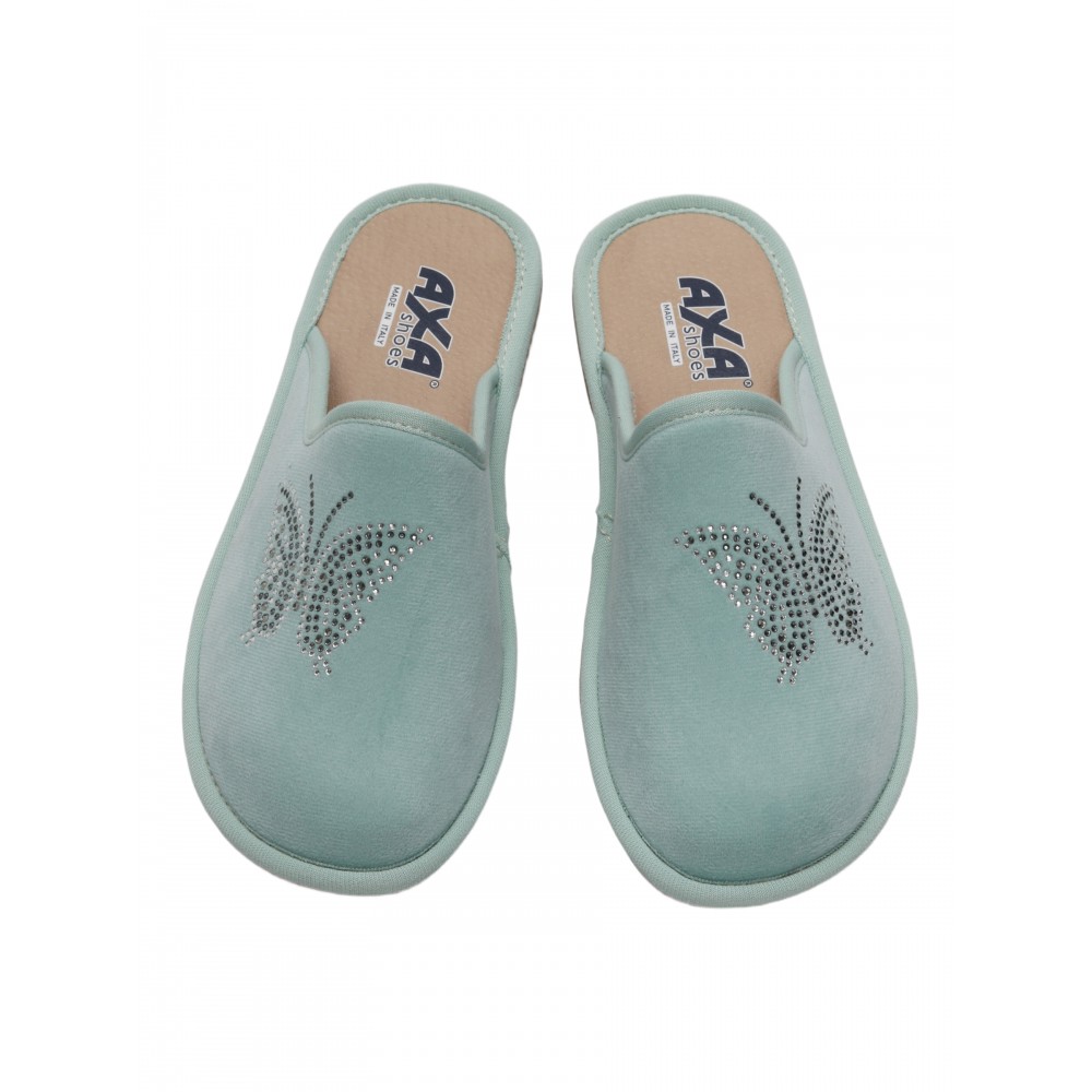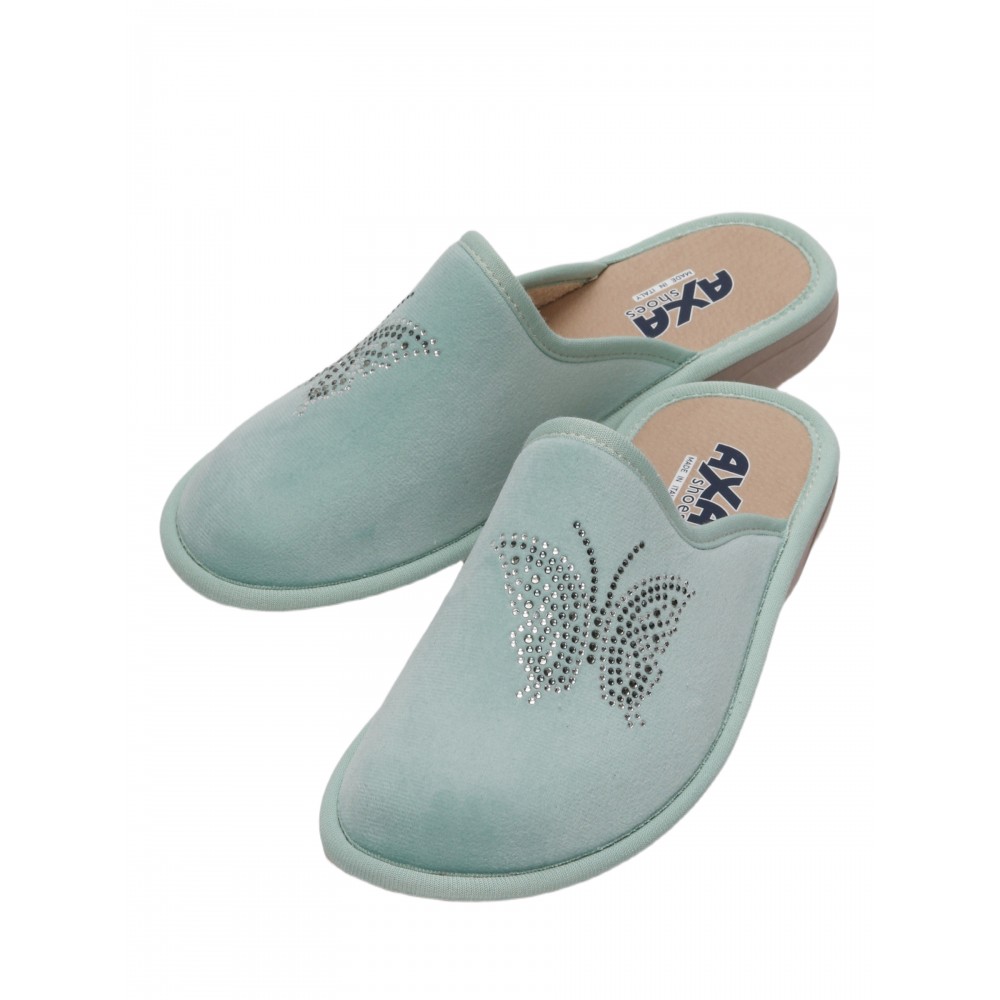 Отличный вариант подарка. Итальянский производитель AXA Shoes Italia представляет комфортные домашние тапочки. Женские тапочки AXA Shoes — это комфортная обувь для дома, в которой применены уникальные запатентованные технологии. Материал верха – велюр, выполнен из натурального качественного хлопка, украшенного стразами. Дизайн придаёт модели особый шарм и навеян домашним уютом. Модель представлена в нескольких цветах. Стельки выполнены из экокожи с использованием угольной пыли, которая абсорбирует часть влажности ступни. Данный процесс имеет антибактериальный эффект. Гибкая подошва из ПВХ имеет подложку из вспененного латекса, который при ходьбе принимает форму вашей стопы. Подошва с технологий «Анти-шок» уменьшает нагрузку на позвоночник и суставы. Благодаря технологии DEO-FIT тапочки имеют нежный цветочный аромат, который сохраняется в течение 6 месяцев. Технология DEO-PUSH позволяет продлить этот аромат. Для этого в отверстие подошвы можно впрыснуть ваш любимый парфюм. Домашняя обувь позволяет снизить усталость в ногах, является прекрасным расслабляющим средством для всех тех, кто в течение дня проводит много времени на ногах. Носите удобную и качественную обувь AXA с удовольствием! Обратите внимание, что тапочки AXA произведены в Италии с европейскими размерами, поэтому рекомендуется заказывать комнатные тапочки на размер больше.