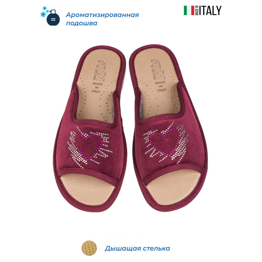 Открытые женские тапочки AXA Shoes — это комфортная обувь для дома, в которой применены уникальные запатентованные технологии. Материал верха – велюр, выполнен из натурального качественного хлопка, украшенного стразами. Дизайн придаёт модели особый шарм и навеян домашним уютом. Модель представлена в винном цвете. Стельки выполнены из экокожи с использованием угольной пыли, которая абсорбирует часть влажности ступни. Данный процесс имеет антибактериальный эффект. Гибкая подошва из ПВХ имеет подложку из вспененного латекса, который при ходьбе принимает форму вашей стопы. Подошва с технологий «Анти-шок» уменьшает нагрузку на позвоночник и суставы. Благодаря технологии DEO-FIT тапочки имеют нежный цветочный аромат, который сохраняется в течение 6 месяцев. Технология DEO-PUSH позволяет продлить этот аромат. Для этого в отверстие подошвы можно впрыснуть ваш любимый парфюм. Домашняя обувь позволяет снизить усталость в ногах, является прекрасным расслабляющим средством для всех тех, кто в течение дня проводит много времени на ногах. Отличный подарок на любой праздник. Носите удобную и качественную обувь AXA с удовольствием!  Обратите внимание, что тапочки AXA произведены в Италии с европейскими размерами, поэтому рекомендуется заказывать комнатные тапочки на размер больше.