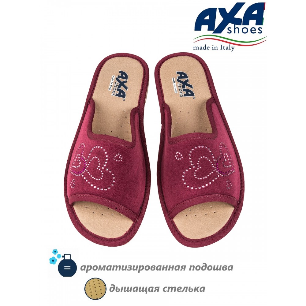 Открытые тапочки домашние AXA Shoes Italia в бордовом цвете. Женские домашние тапочки AXA Shoes — это комфортная обувь, в которой применены уникальные запатентованные технологии. Материал верха – велюр, выполнен из натурального качественного хлопка, украшенного стразами. Дизайн придаёт модели особый шарм и навеян домашним уютом. Модель представлена в нескольких цветах. Стельки выполнены из экокожи с использованием угольной пыли, которая абсорбирует часть влажности ступни. Данный процесс имеет антибактериальный эффект. Гибкая подошва из ПВХ имеет подложку из вспененного латекса, который при ходьбе принимает форму вашей стопы. Подошва с технологий «Анти-шок» уменьшает нагрузку на позвоночник и суставы. Благодаря технологии DEO-FIT тапочки имеют нежный цветочный аромат, который сохраняется в течение 6 месяцев. Технология DEO-PUSH позволяет продлить этот аромат. Для этого в отверстие подошвы можно впрыснуть ваш любимый парфюм. Домашняя обувь позволяет снизить усталость в ногах, является прекрасным расслабляющим средством для всех тех, кто в течение дня проводит много времени на ногах. Отличный подарок на любой праздник. Носите удобную и качественную обувь AXA с удовольствием!  Обратите внимание, что тапочки AXA произведены в Италии с европейскими размерами, поэтому рекомендуется заказывать комнатные тапочки на размер больше.